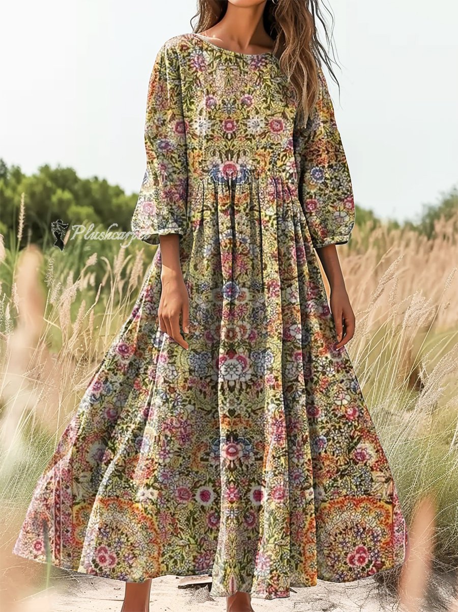 Women's Retro Ethnic Flowers Art Print Flowy Cotton Crew Neck Dress