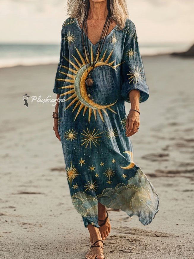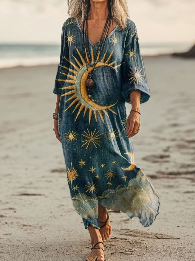 Women's Sun, Moon & Stars Tattoo Pattern Art Print Pocket Cotton Dress