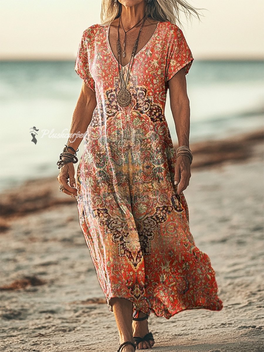 Women's Art Floral Hippie Vintage Print V Neck Dress