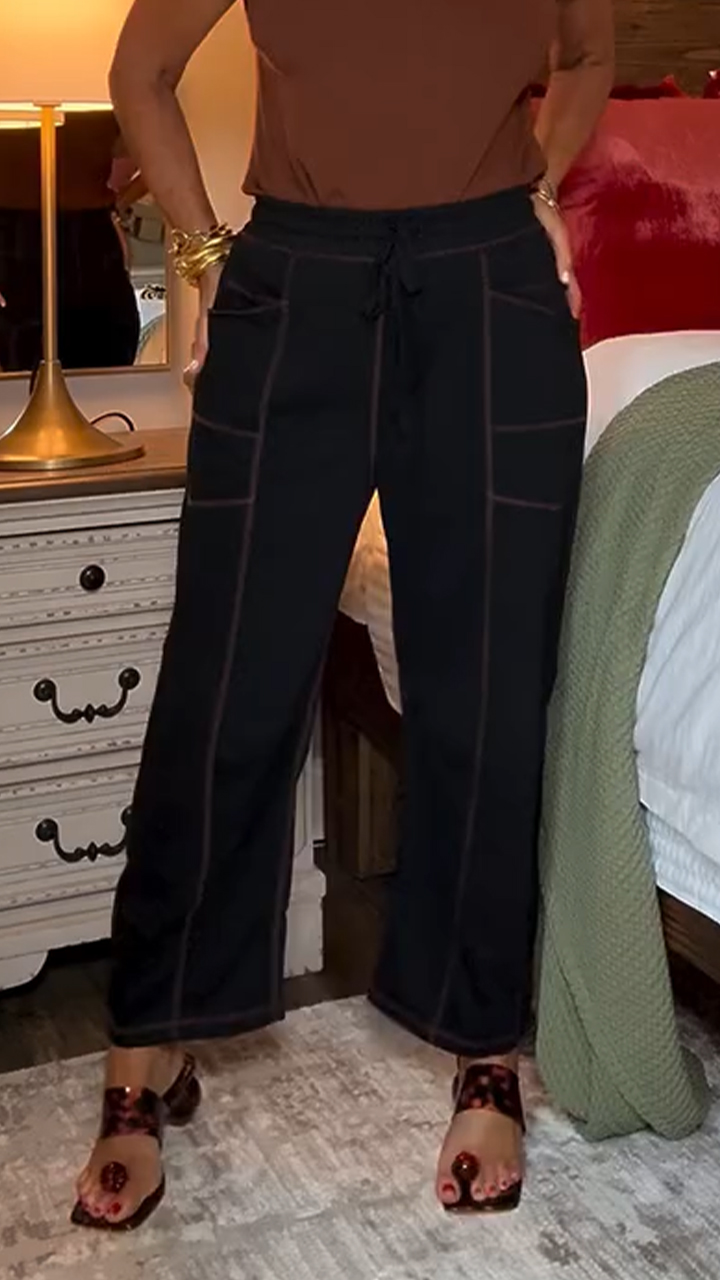 These pants feature a sleek black base highlighted by subtle brown contrast stitching, adding a touch of visual interest to a classic silhouette. The wide - leg cut offers a relaxed, flowy fit, while the drawstring waist ensures a customizable, comfortable feel. It’s like elevating your loungewear to chic new heights, perfect for running errands, casual outings, or any day you want to look put - together without sacrificing comfort.
