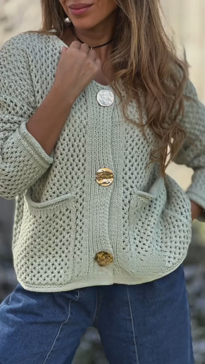 This cardigan features a delicate pink hue that exudes femininity and warmth. The intricate open - knit pattern adds texture and breathability, while the oversized statement buttons in metallic finishes bring a touch of retro glamour. The relaxed fit and dropped shoulders create a laid - back, yet polished look, making it perfect for casual outings, coffee dates, or any occasion where you want to wrap yourself in cozy elegance.