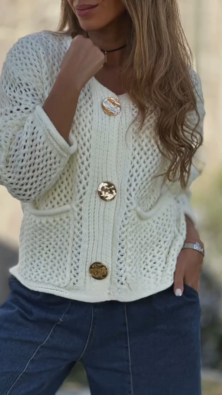This cardigan features a delicate pink hue that exudes femininity and warmth. The intricate open - knit pattern adds texture and breathability, while the oversized statement buttons in metallic finishes bring a touch of retro glamour. The relaxed fit and dropped shoulders create a laid - back, yet polished look, making it perfect for casual outings, coffee dates, or any occasion where you want to wrap yourself in cozy elegance.
