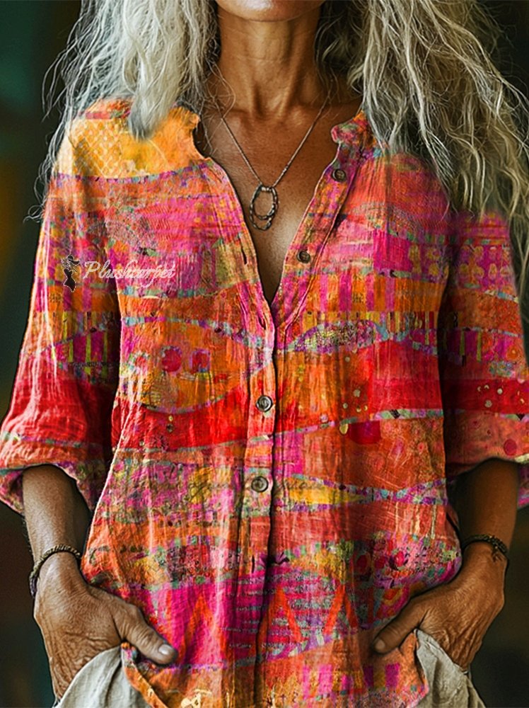 Women's Abstract Ethnic Art Pattern Print Casual Cotton Linen Shirt