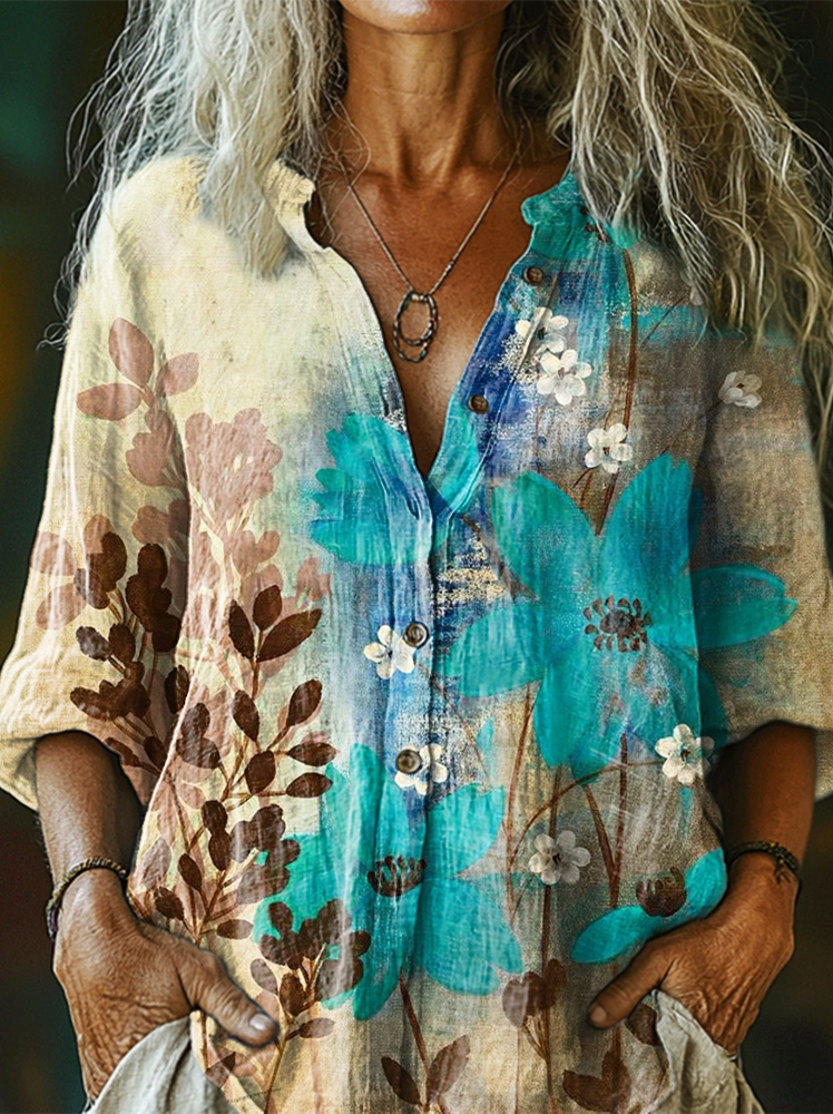 Women's Art Painting Blue Floral Contrast Vintage Print Long Sleeve Shirt