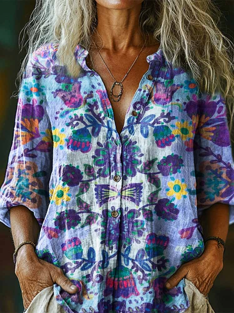 Women's Bohemian Ethnic Floral Art Pattern Print Casual Cotton Linen Shirt