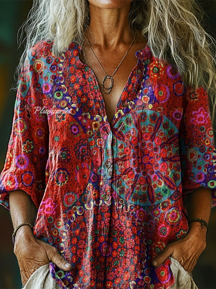 Women's Bohemian Ethnic Mandala Art Print Casual Cotton Linen Shirt