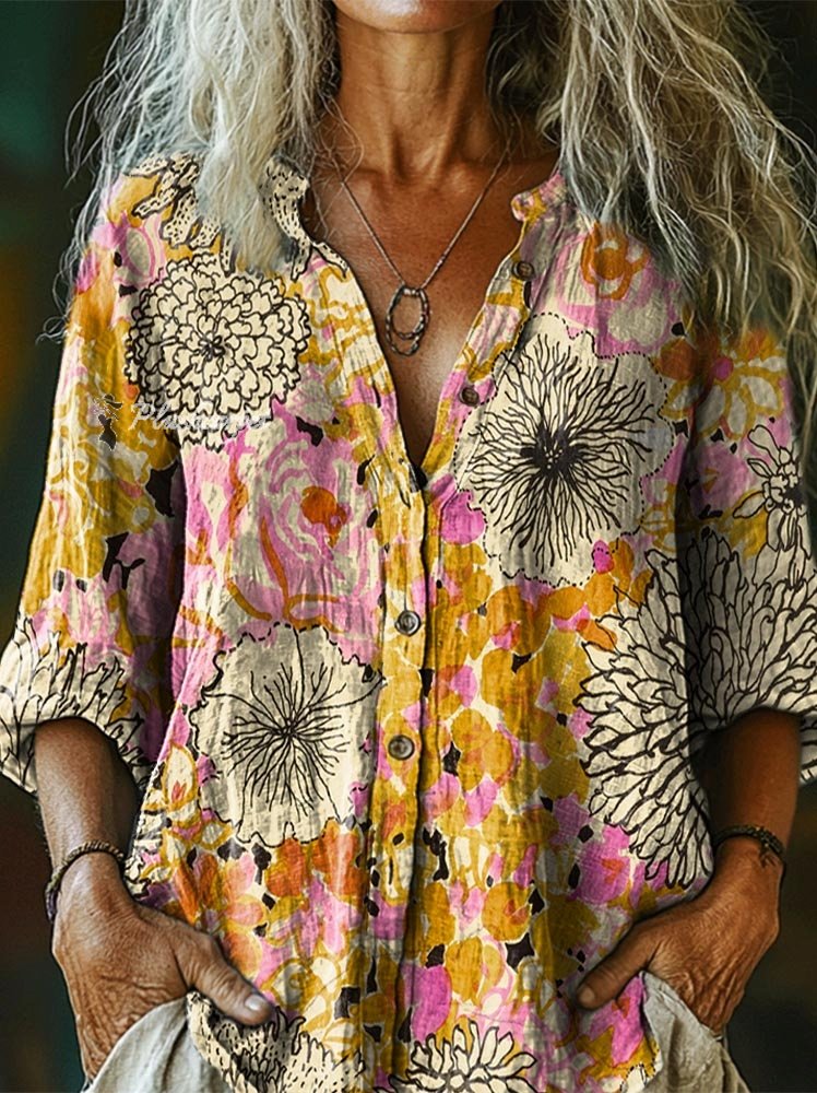 Women's Bohemian Floral Collage Art Print Casual Cotton Linen Shirt