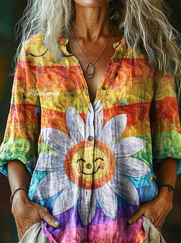 Women's Cute Hippie Daisy Print Casual Cotton Linen Shirt