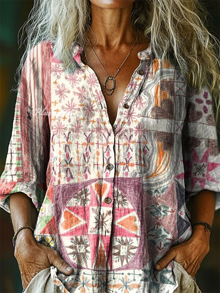 Women's Ethnic Tattoo Pattern Art Print Casual Cotton Linen Shirt