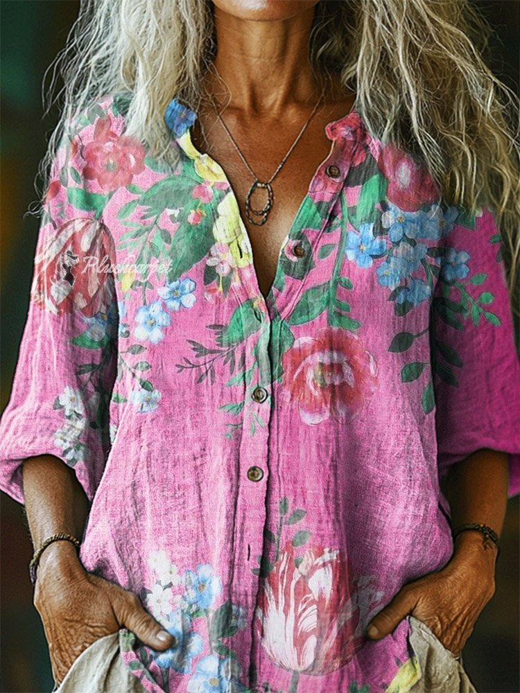 Women's Floral Pattern Art Print Casual Cotton Linen Shirt