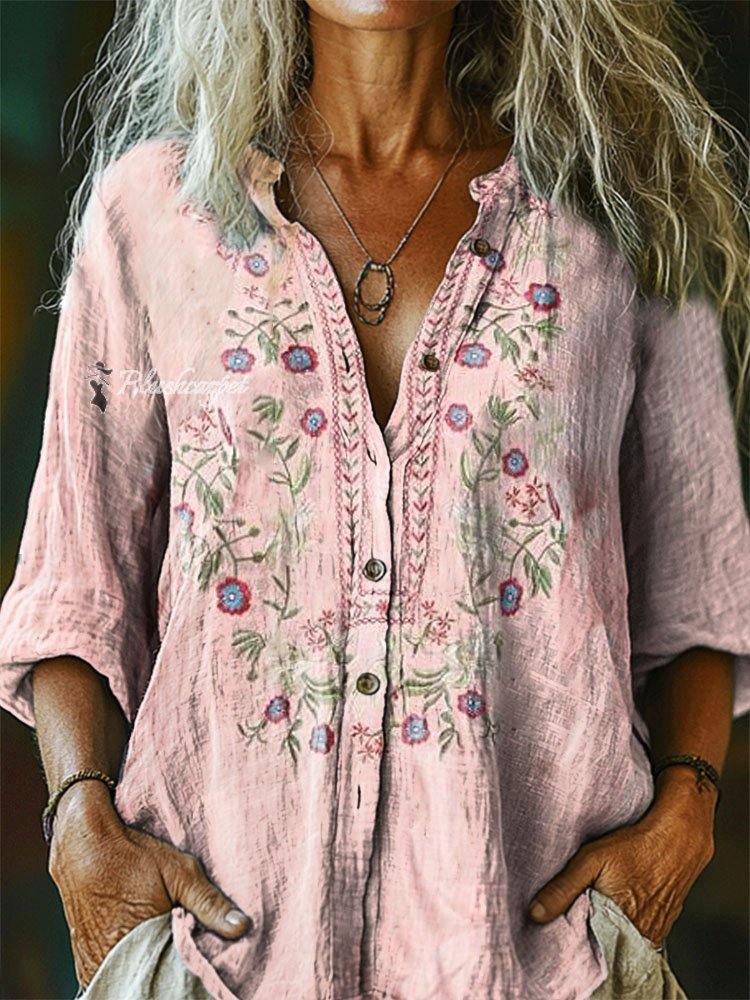Women's Floral Pattern Art Print Casual Cotton Linen Shirt