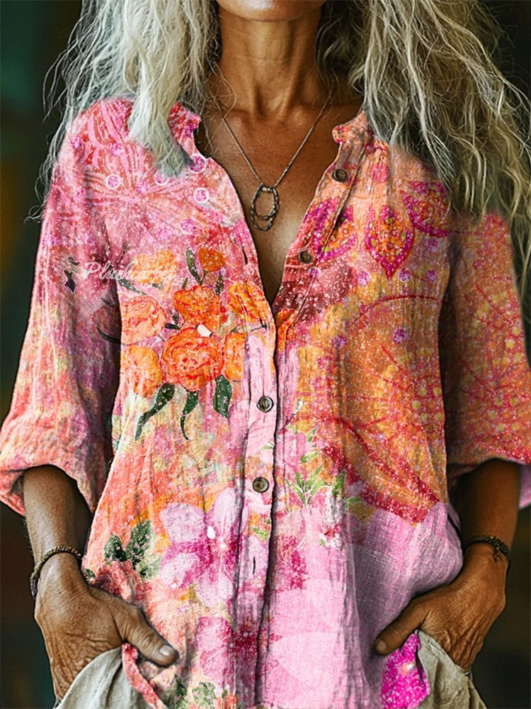 Women's Floral Pattern Art Print Casual Cotton Linen Shirt
