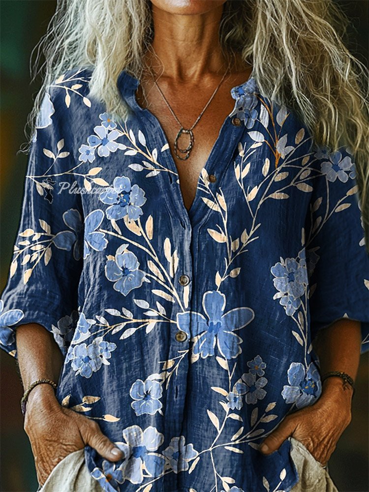 Women's Floral Pattern Art Print Casual Cotton Linen Shirt