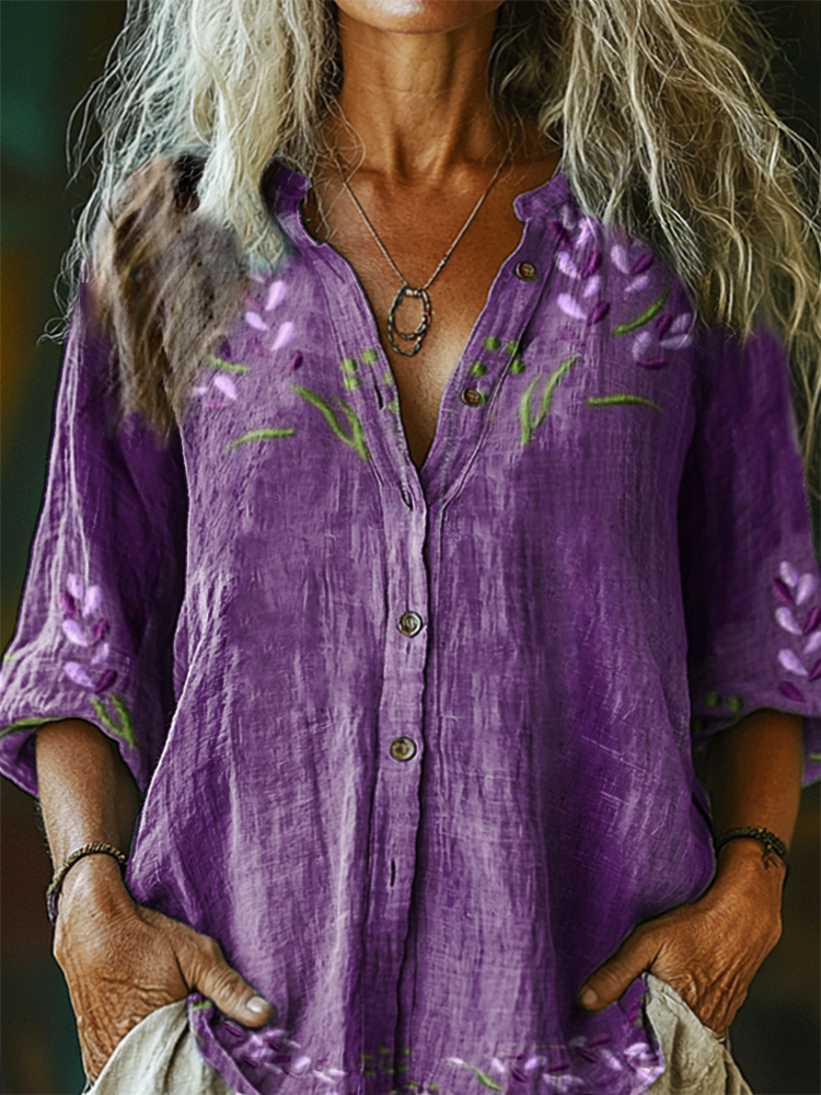 Women's Floral Pattern Art Print Casual Cotton Linen Shirt