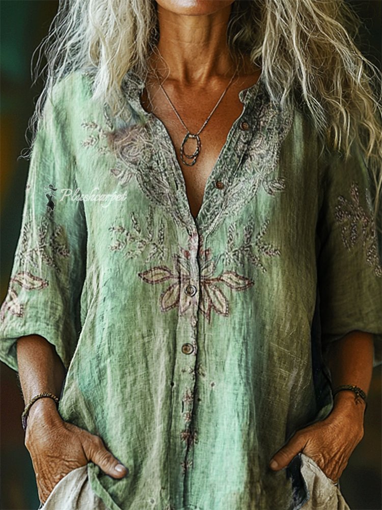 Women's Floral Tattoo Pattern Art Print Casual Cotton Linen Shirt