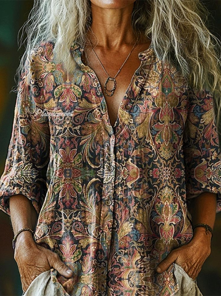Women's Flowers Art Print Casual Cotton And Linen Shirt