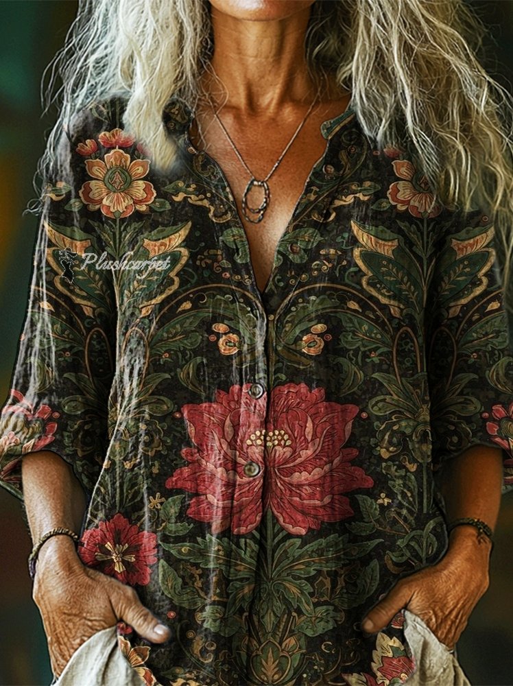 Women's Folk Art Floral Pattern Art Pattern Print Casual Cotton Linen Shirt