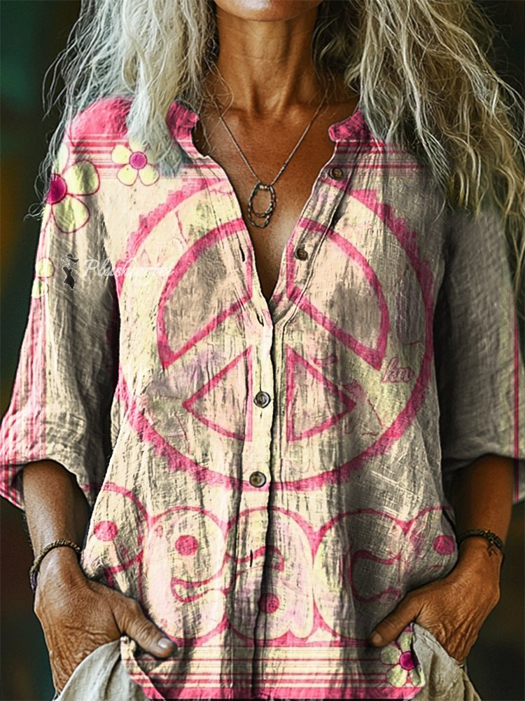 Women's Hippie Peace Art Print Casual Cotton Linen Shirt