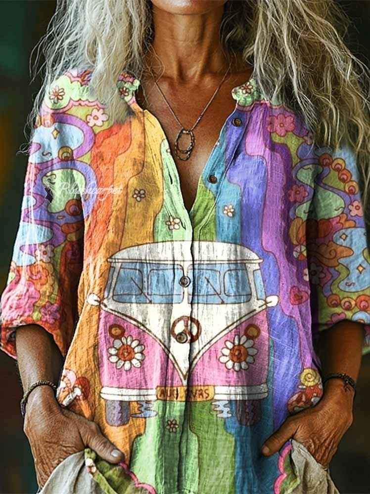 Women's Hippie Peace Love Car Art Pattern Print Casual Cotton Linen Shirt