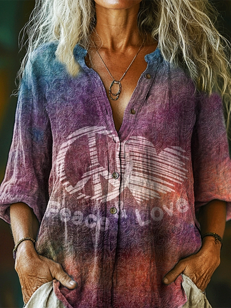 Women's Hippie Peace Love Print Casual Cotton Linen Shirt