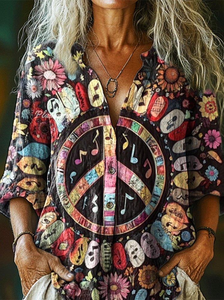 Women's Hippie Peace Note Art Pattern Print Casual Cotton Linen Shirt
