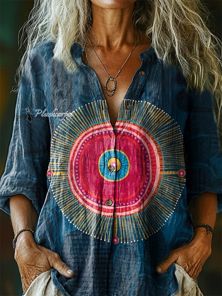 Women's Irregular Round Clashing Color Pattern Art Print Linen Cotton Casual Shirt