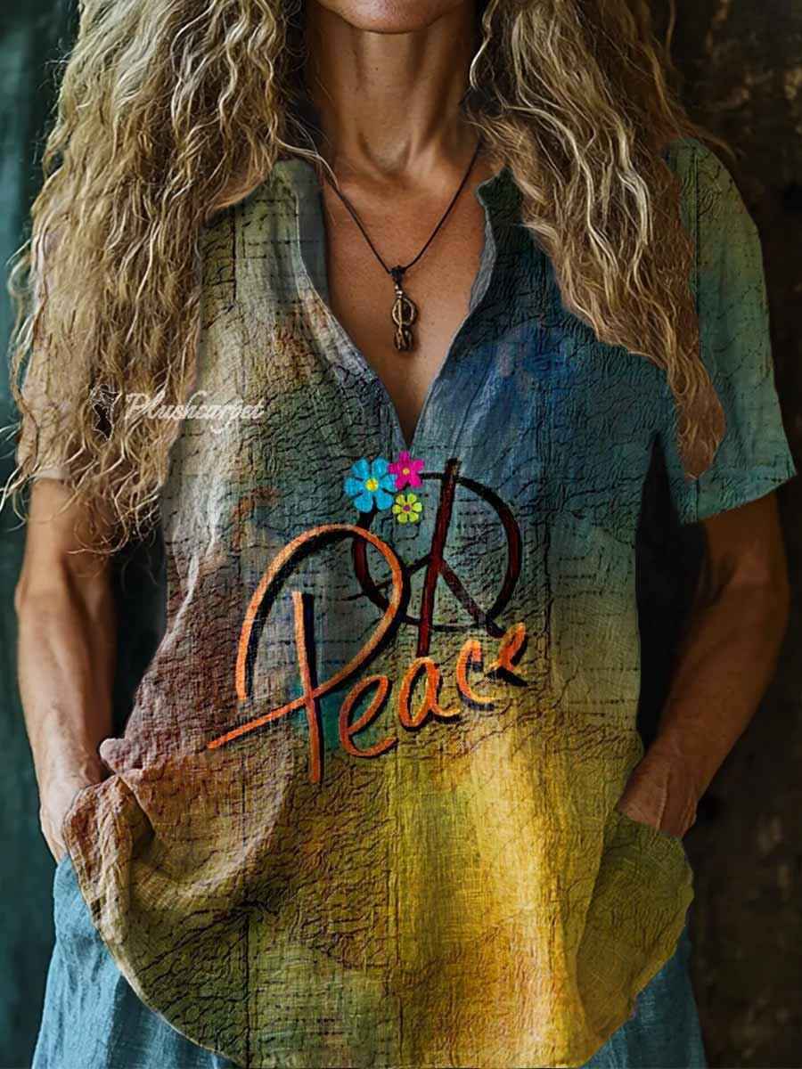 Women's Love Peace Hippie Pattern Art Print Casual Short Sleeve Comfortable Cotton Shirt