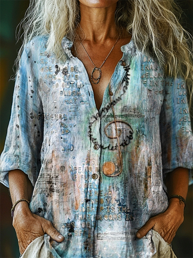 Women's Note Pattern Art Print Casual Cotton Linen Shirt