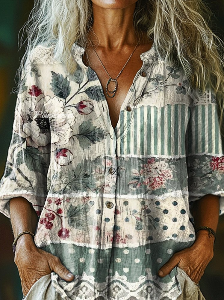 Women's Retro Floral Collage Print Linen And Cotton V-neck Casual Shirt
