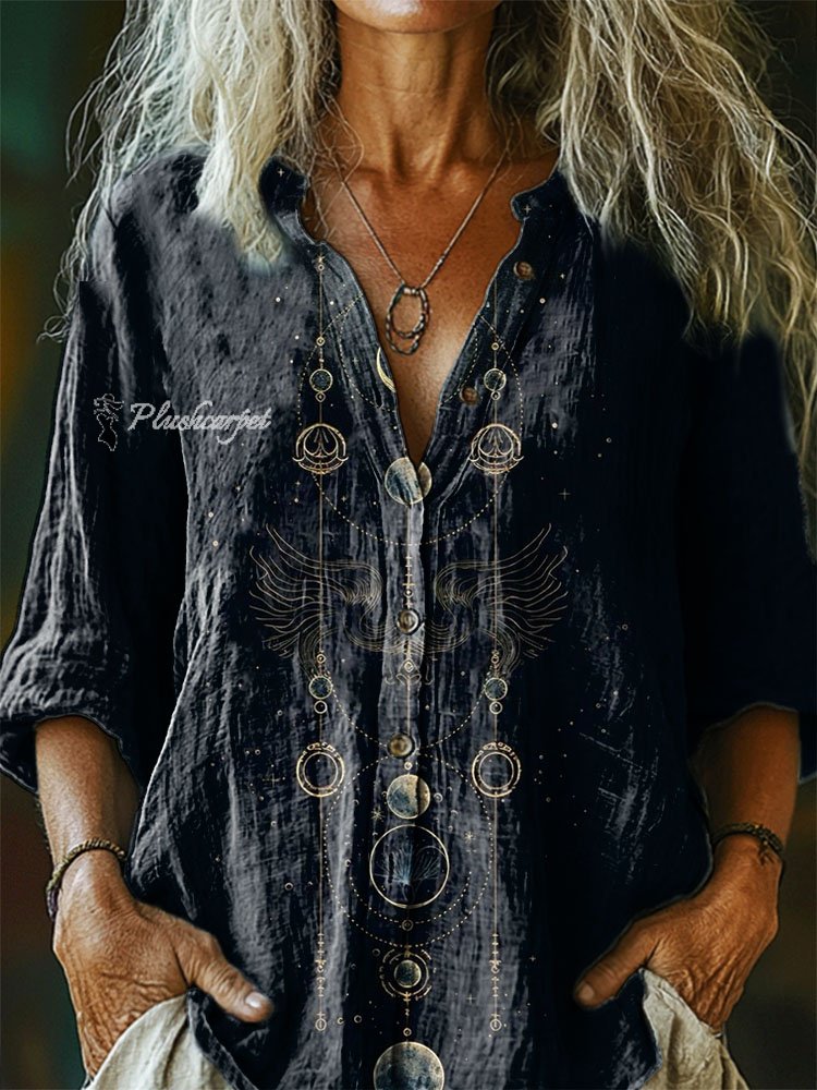 Women's Star and Moon Pattern Art Print Casual Cotton and Linen Shirt