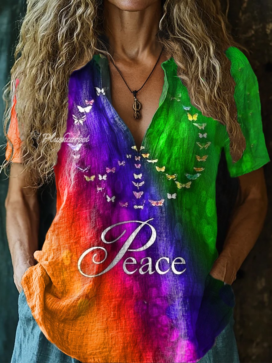 Women's Tie-Dye Love Peace Hippie Pattern Art Print Casual Short Sleeve Comfortable Cotton Shirt