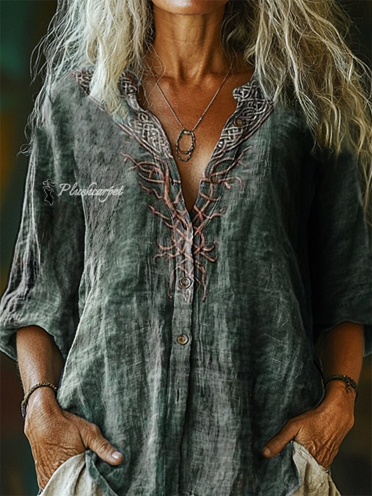 Women's Tree and Vine Pattern Art Print Casual Cotton and Linen Shirt