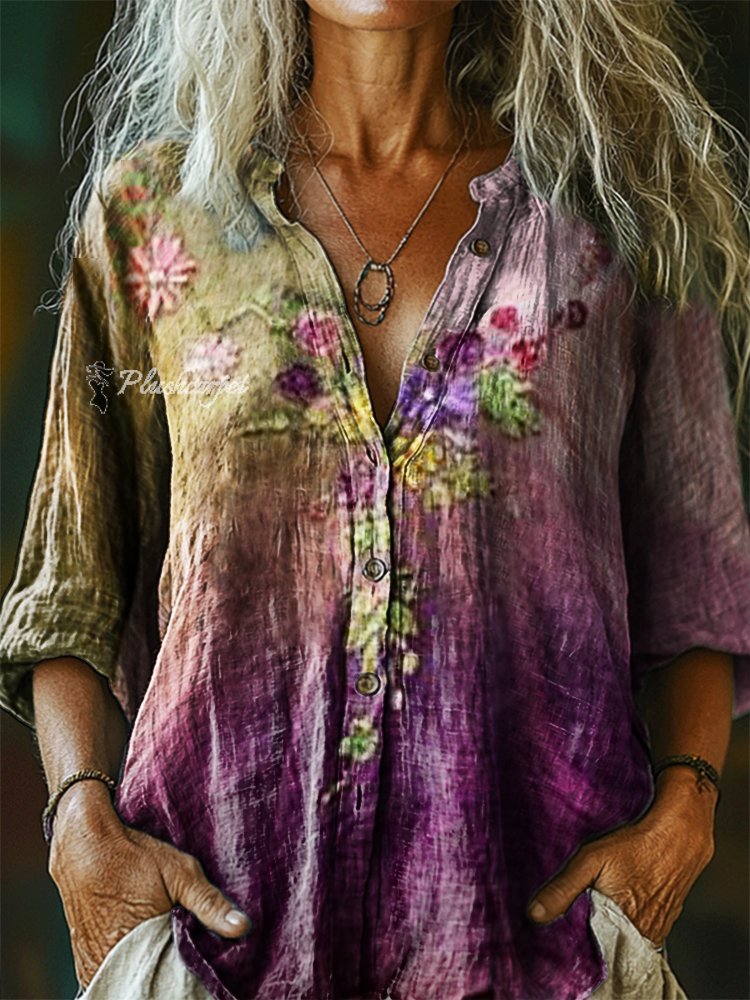 Women's Vintage Bohemian Floral Art Print Casual Cotton Linen Shirt