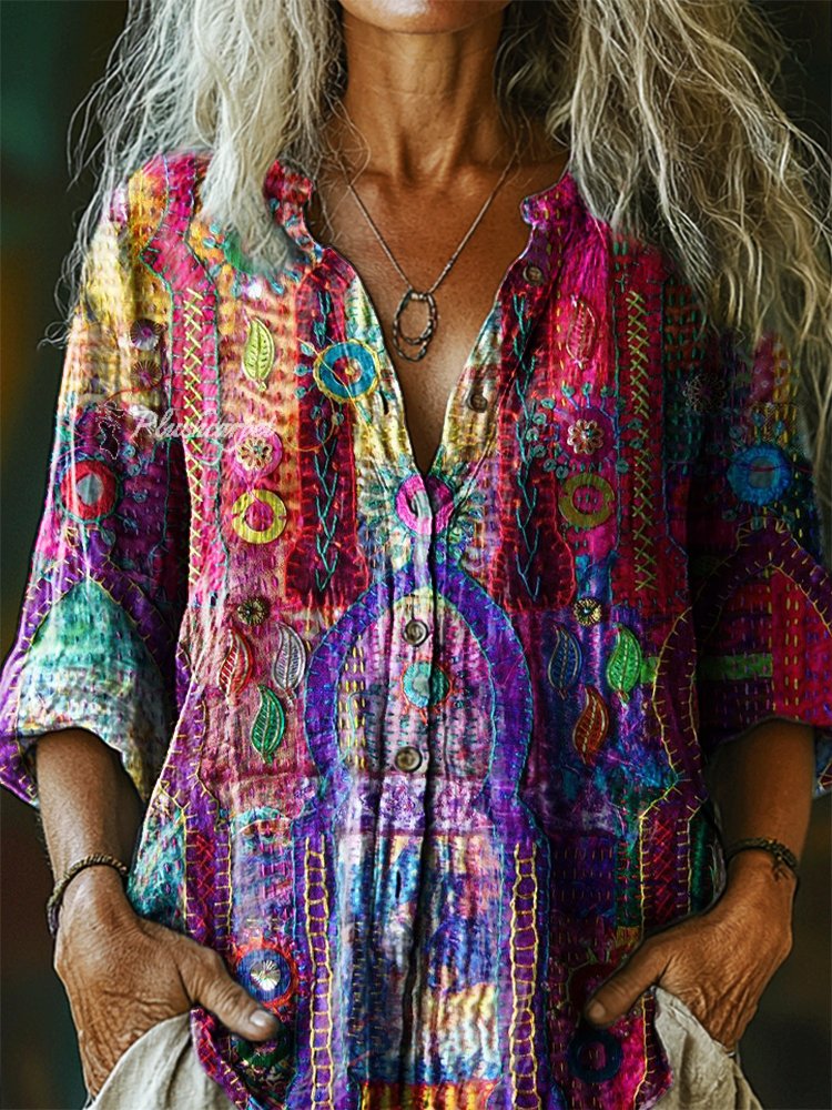 Women's Vintage Bohemian Floral Art Print Casual Cotton Linen Shirt