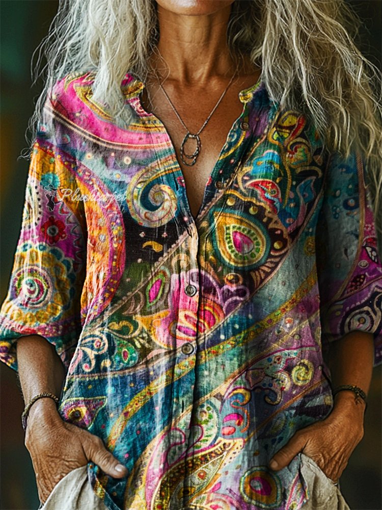 Women's Vintage Bohemian Floral Art Print Casual Cotton Linen Shirt
