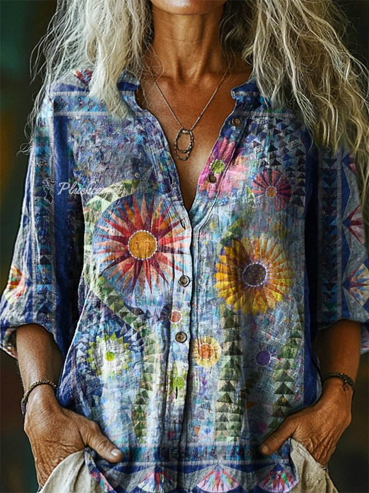 Women's Vintage Bohemian Floral Art Print Casual Cotton Linen Shirt