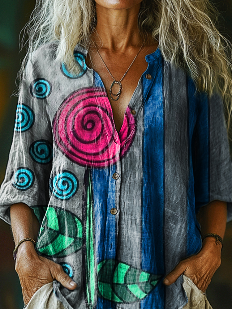 Women's Vintage Bohemian Floral Art Print Casual Cotton Linen Shirt