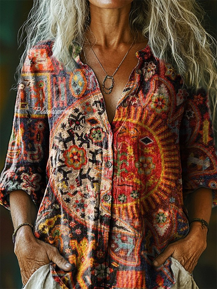 Women's Vintage Bohemian Totem Patterns Art Print Casual Cotton Linen Shirt