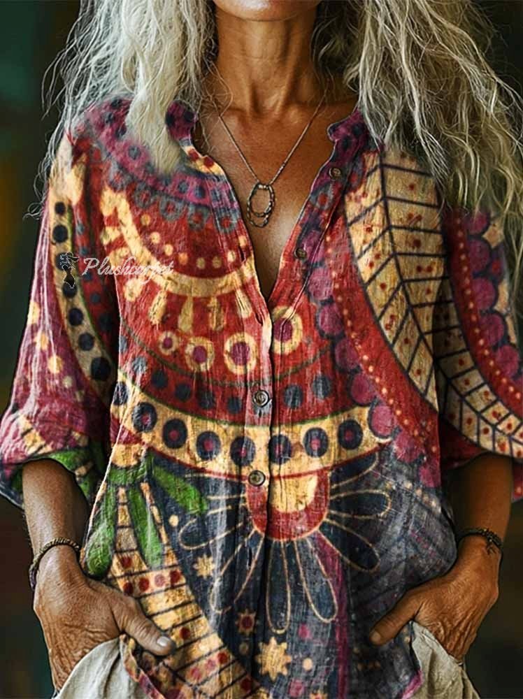 Women's Vintage Boho Ethnic Floral Art Print Casual Cotton Linen Shirt