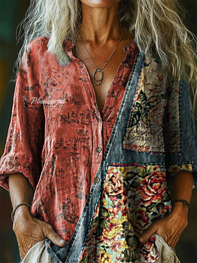 Women's Vintage Ethnic Floral Art Print Casual Cotton Linen Shirt