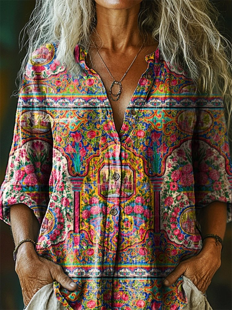 Women's Vintage Ethnic Floral Art Print Casual Cotton Linen Shirt