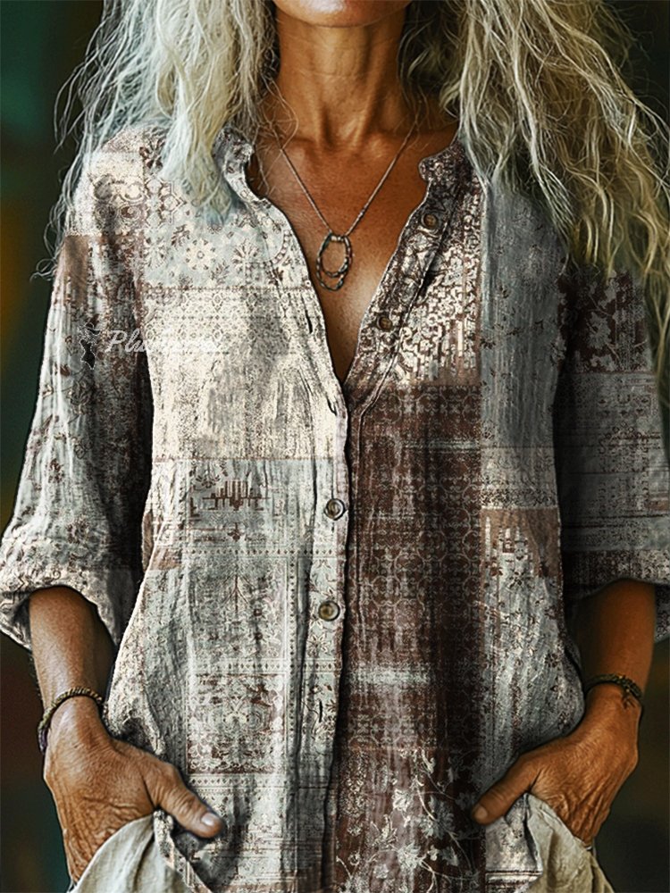 Women's Vintage Ethnic Floral Art Print Casual Cotton Linen Shirt