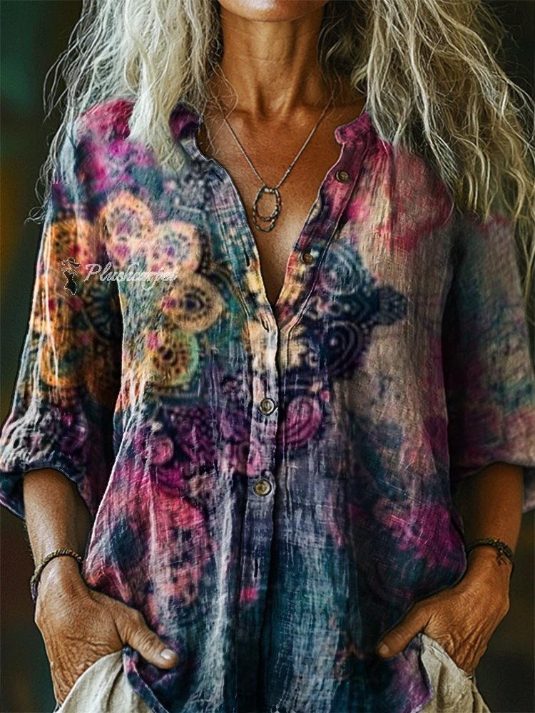 Women's Vintage Ethnic Floral Art Print Casual Cotton Linen Shirt