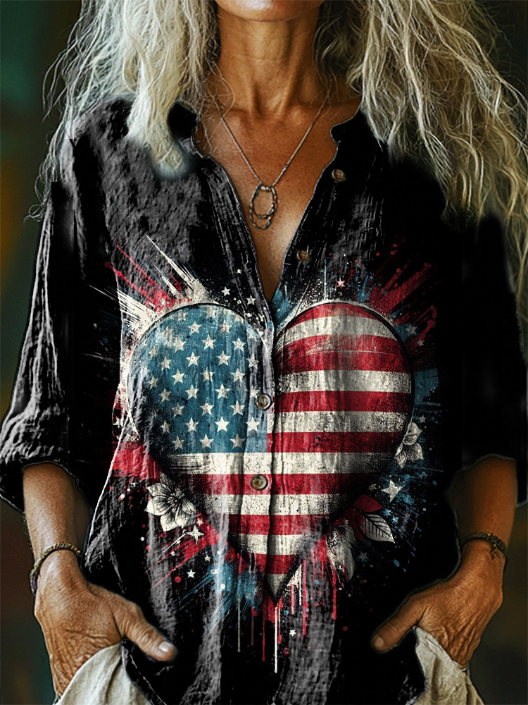 Women's Vintage Flag Love Art Print Casual Cotton Linen Shirt