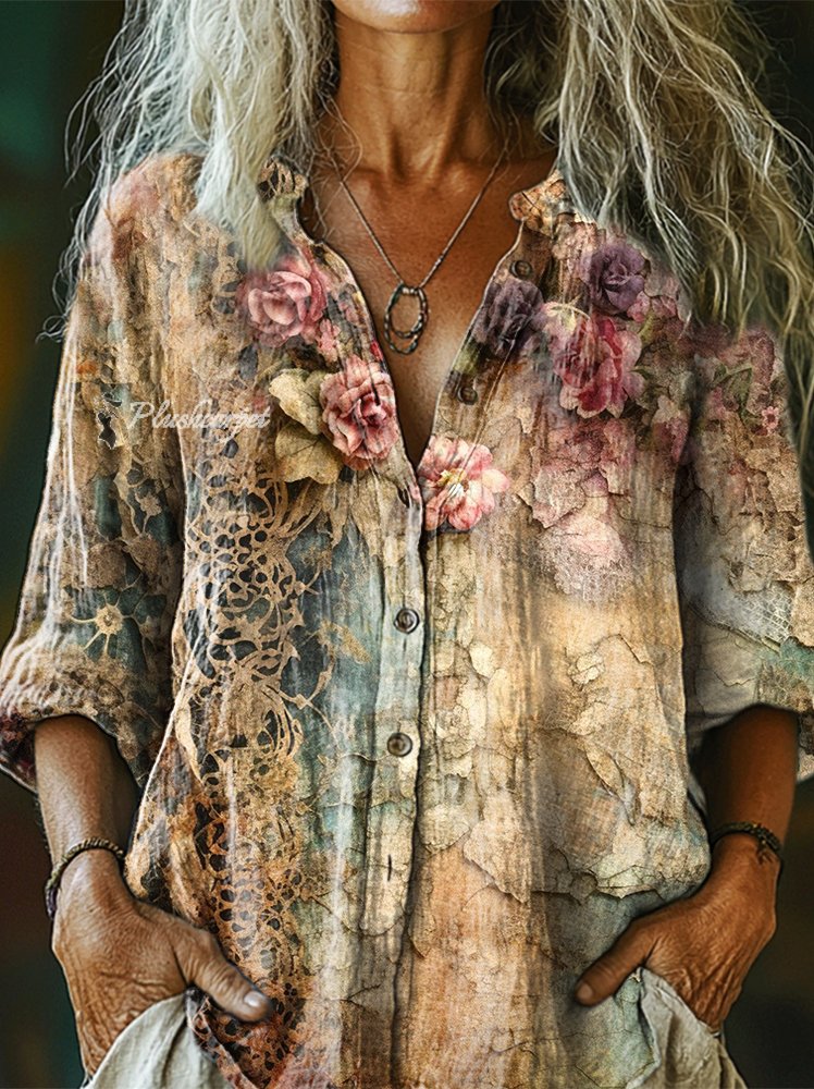 Women's Vintage Floral Art Patterns Print Linen And Cotton V-neck Casual Shirt