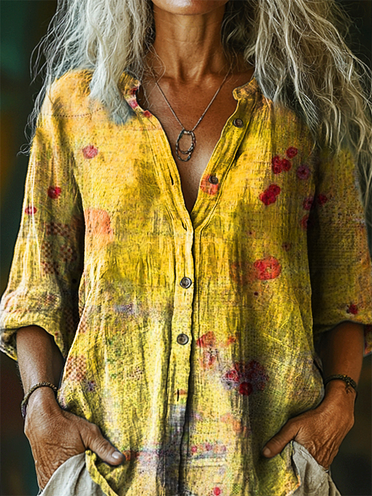 Women's Vintage Floral Art Print Casual Cotton Linen Shirt