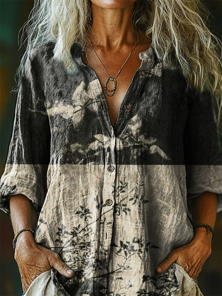 Women's Vintage Floral Art Print Casual Cotton Linen Shirt