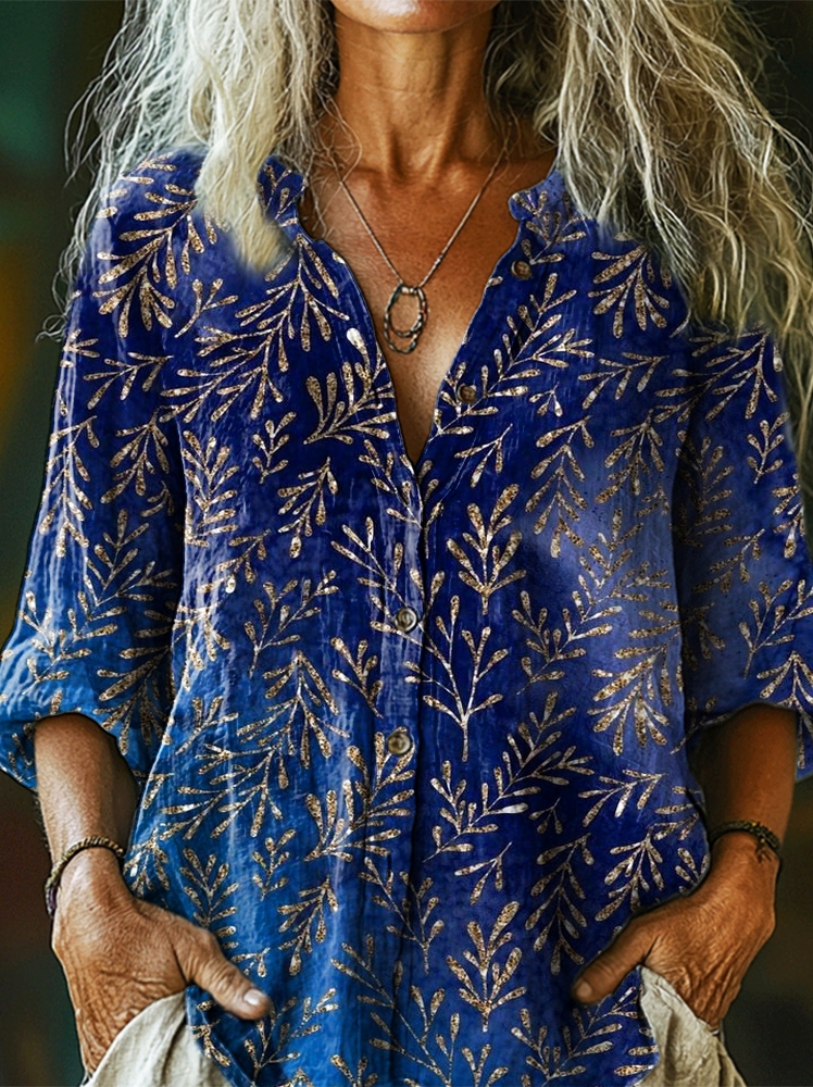 Women's Vintage Floral Art Print Casual Cotton Linen Shirt