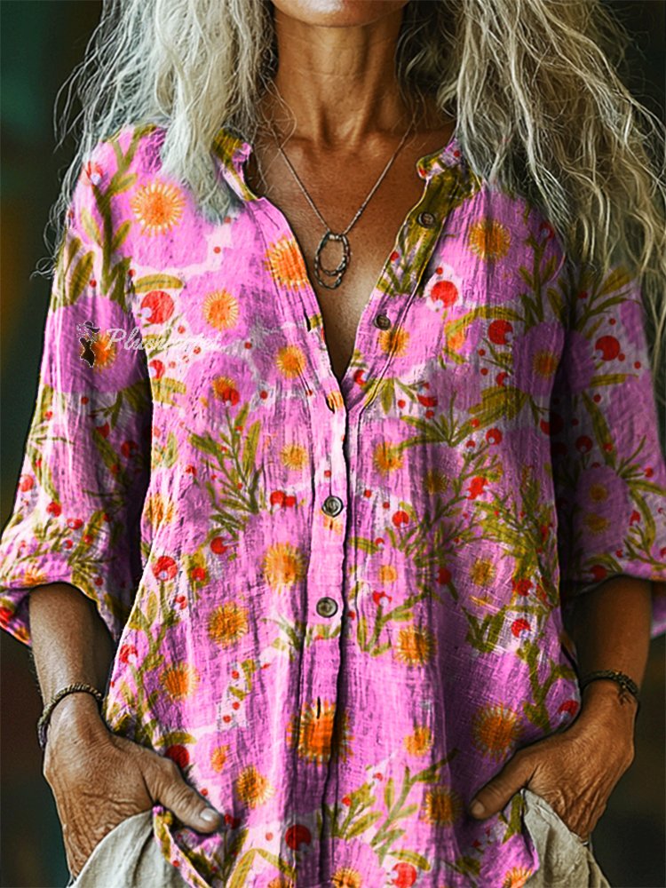 Women's Vintage Floral Art Print Casual Cotton Linen Shirt