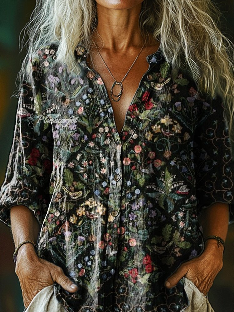 Women's Vintage Floral Art Print Casual Cotton Linen Shirt
